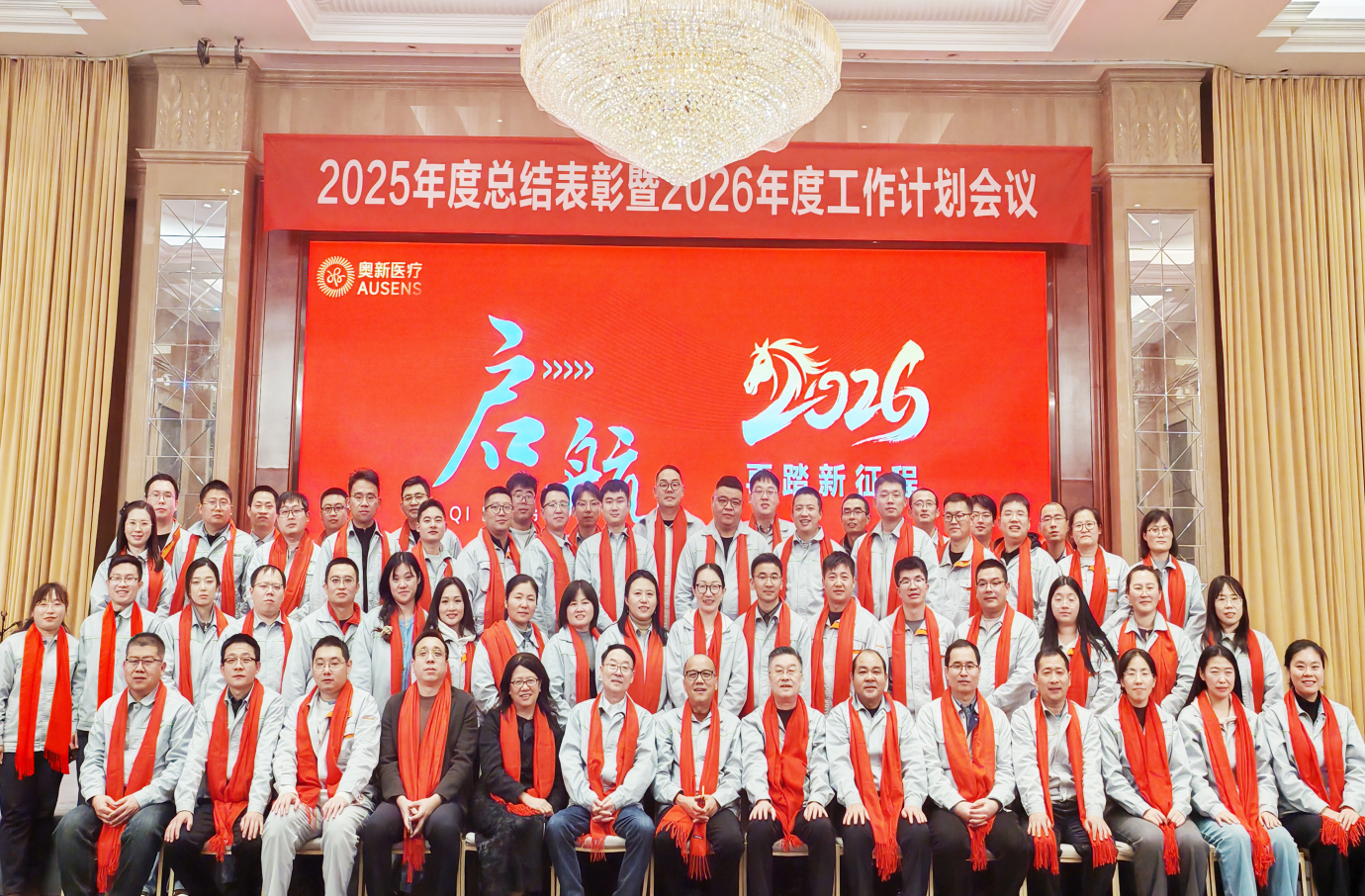 岁序开,征途再启,2026年奋进征程已然扬帆起航。值此马年新春将至之际,我们乘骐骥之远志,启新程之盛景,以昂扬之姿向更高目标攀越、向创新领域攀升、向长远征程迈进。2月9日,“乘骐骥 启新程”2025年奥新医疗年度总结表彰暨2026年度工作计划会议,在富华国际大酒店隆重拉开帷幕。全体奥新人欢聚一堂、共襄盛会,全面复盘2025年耕耘硕果,凝聚奋进力量,共商2026年发展新局、共绘未来发展蓝图。董事长顾军军、董事高金生、执行董事高沪光、总经理李培勇出席会议,特邀嘉宾巨和泓光李晓丽总经理、上海医道匠心曹晓辉总经理应邀莅临,与全体奥新人共赴这场总结过往、致敬奋斗、奔赴新程的年度盛会。